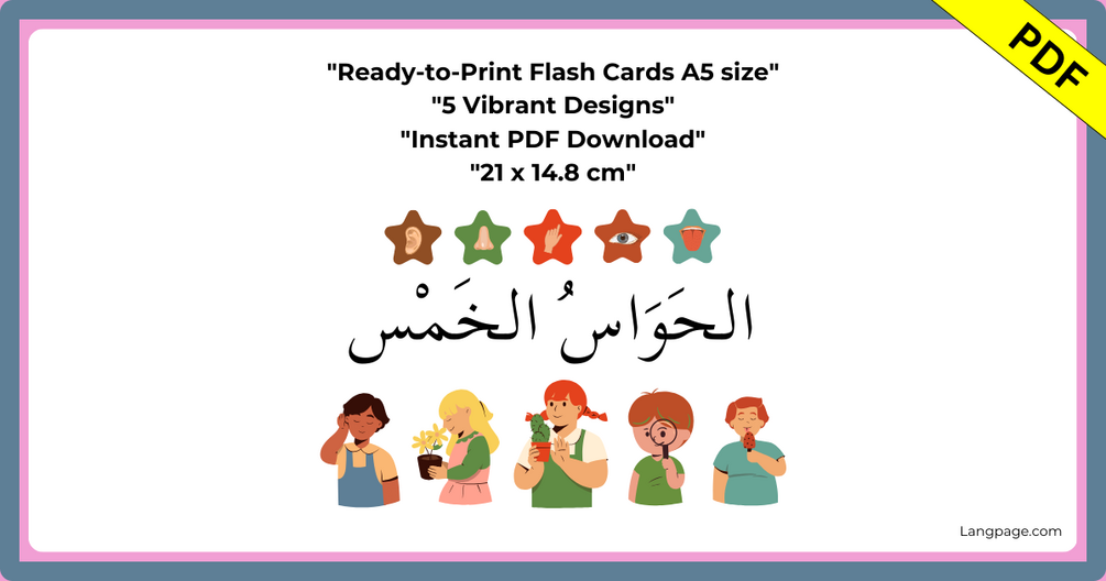 Experience Arabic through your senses with our "The 5 Senses" flashcards. This digital collection is designed to enhance your vocabulary by exploring words and expressions related to sight, sound, touch, taste, and smell. Each card features vibrant visuals, clear Arabic script, and is formatted in A5 size for easy printing. Ideal for classroom activities, self-study, or language workshops, these ready-to-print PDF flashcards offer a multisensory approach to learning Arabic. Download, print, and let your senses guide you on your language journey today!